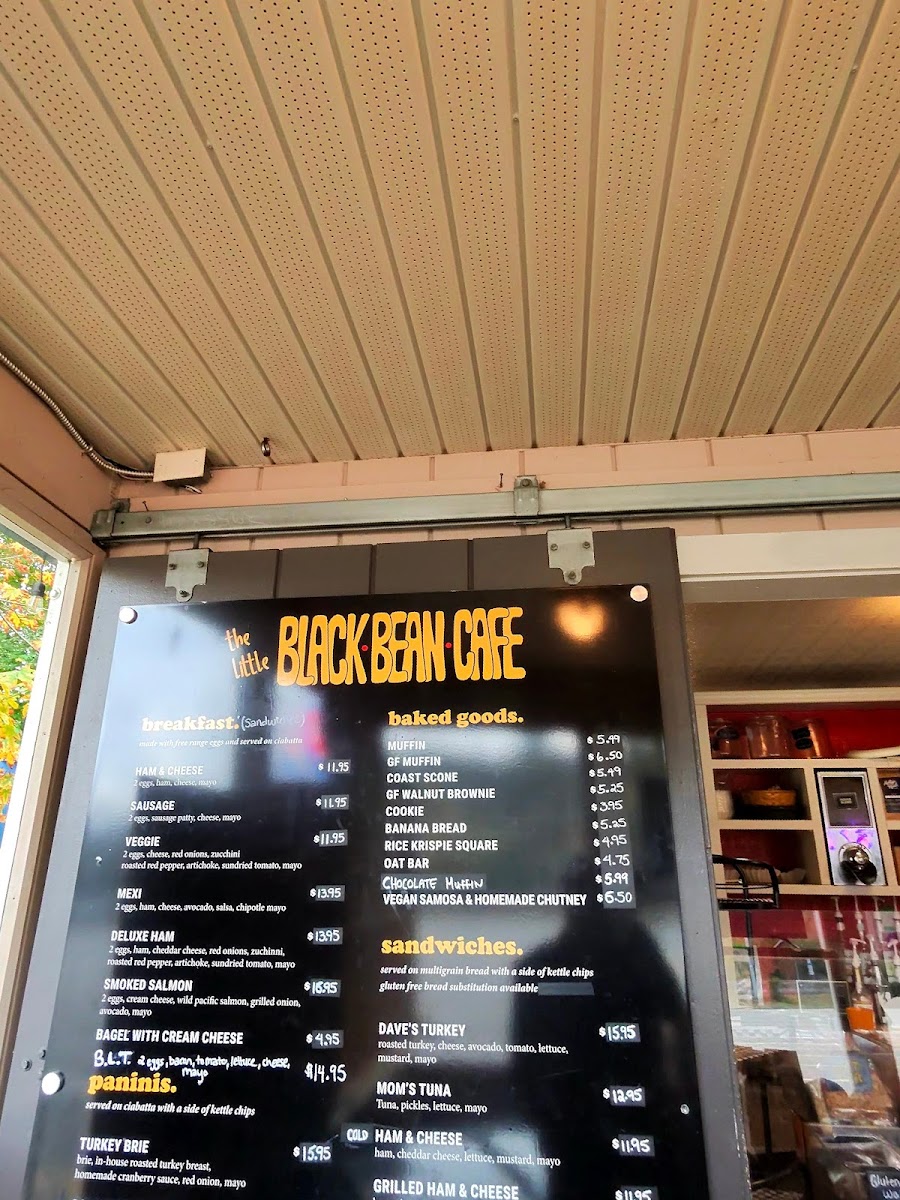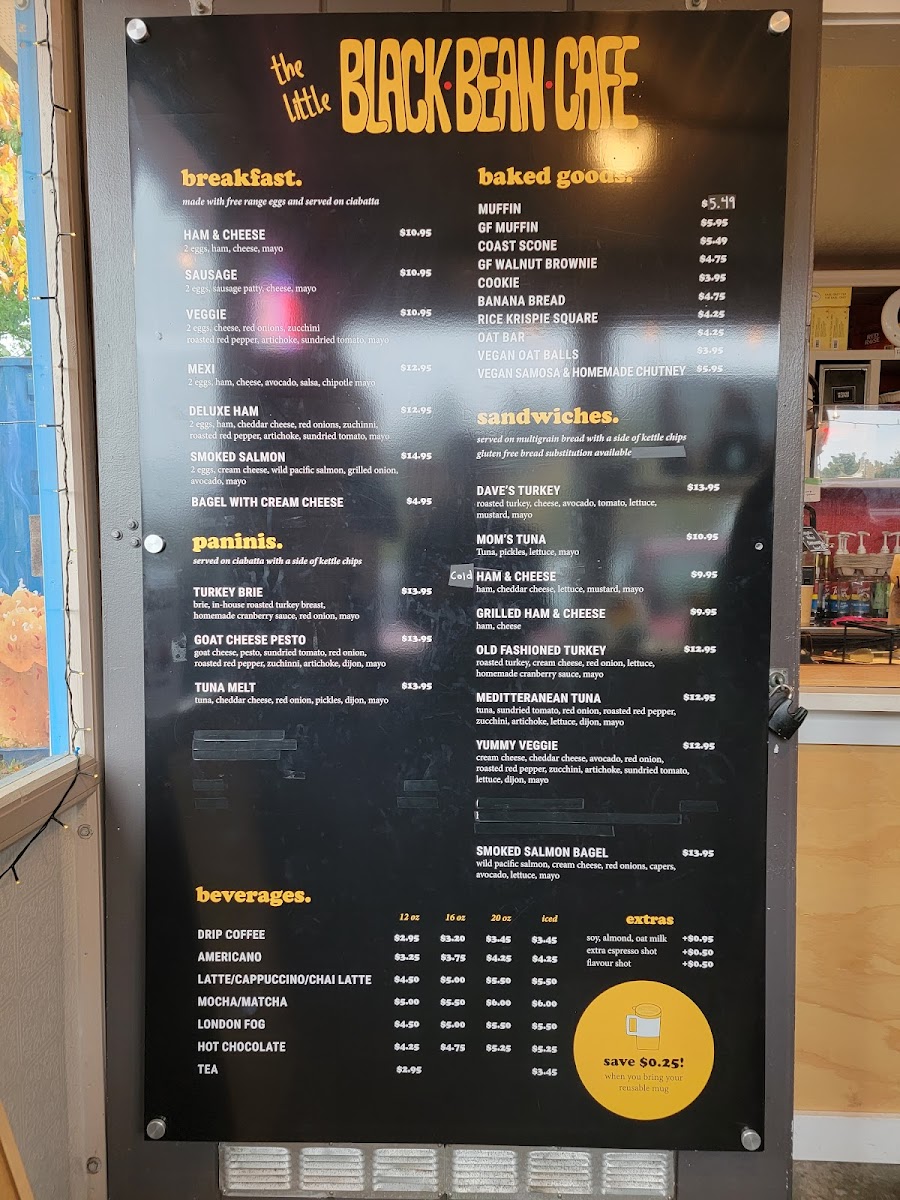 The beverage selection includes a range of hot drinks typical of a café setting, such as drip coffee, Americano, latte, mocha, London fog, and hot chocolate, with prices from CA$2.95 to CA$5.00.